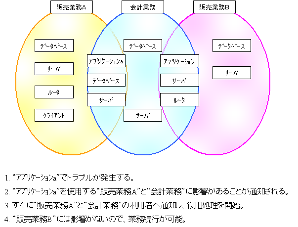 システムやネットワーク、アプリケーションなどで異常が発生した時、どの業務に影響があるのかを、以下のように簡単に把握できます。