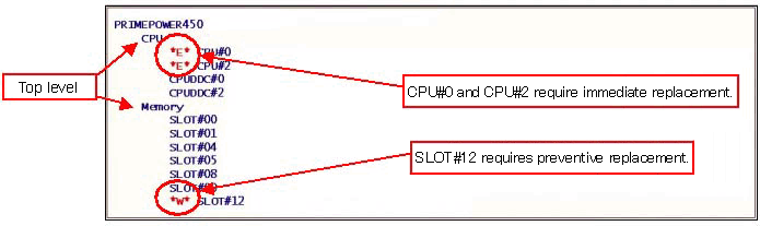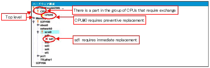 Displays hardware configuration information and the status of each hardware component. It displays the names of CPUs, memory banks, disks, and batteries. It displays also the symbols representing the status of each hardware component. |