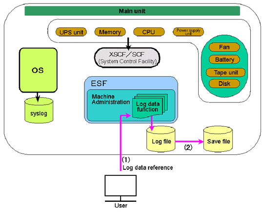 Searches for and displays all the log data (e.g., hardware error monitoring information, life monitoring information, preventive monitoring information, hot swapping log) collected by Machine Administration. The following search conditions are used: