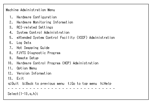 (1): Enter the desired item at the location of the cursor.1-13: To select a menu, enter the menu number.q : If you want to quit the operation, enter "q".h : If you want to display help, enter "h".