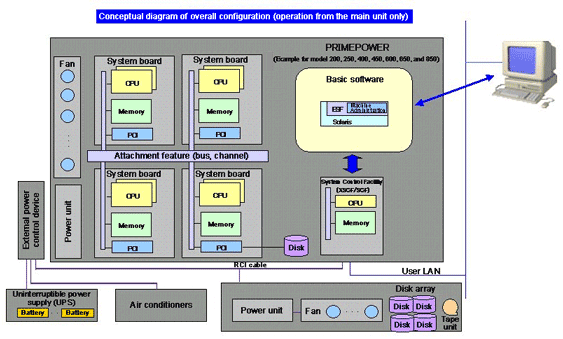 The System Control Facility functions monitors the entire hardware system, including the main unit and externally connected devices. It is a single-board configuration with a dedicated CPU and memory. It monitors the errors that occur in CPUs, memories, PCI units, disks, fans, batteries, etc. |