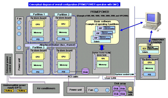 PRIMEPOWER800/900/1000/1500/2000/2500/HPC2500 and GP7000F model 1000/2000 require an SMC. Use PRIMEPOWER1/200/250 as the base platform. The main unit and SMC are connected by a system control LAN and a user LAN. The system control LAN connects the "System Control Facility" to the SMC. On the SMC, "Machine Administration" included in the SCS monitors all hardware components and partitions in cooperation with the System Control Facility. To use "Machine Administration," log in to the SMC (Solaris) from the terminal connected to the SCS via the user LAN. PRIMEPOWER250 can be used as the base platform from SCS2.3 and later. |