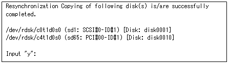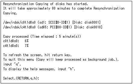 You can also enter "q" to quit the progress display. In this case, resynchronization copying will continue in the background. You can check whether resynchronization copying is complete by using the sdxinfo command or checking messages output to /var/adm/messages. For more information, refer to the "SynfinityDisk Handbook" or "PRIMECLUSTER Global Disk Services Handbook."