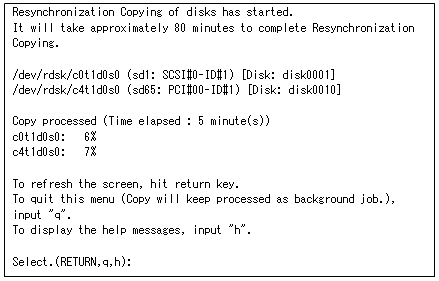 You can also enter "q" to quit the progress display. In this case, resynchronization copying continues to be executed in the background.