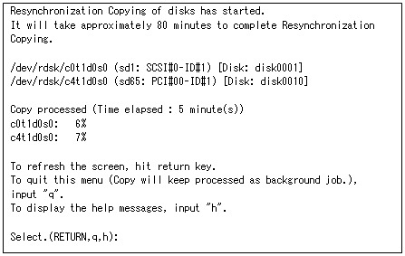 You can also enter "q" to quit the progress display. In this case, resynchronization copying continues to be executed in the background.