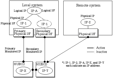 In this mode, duplicated NICs are connected to the same network and switching control of lines is performed based on the exclusive use (During normal operation, one NIC is made to go "up" for communication). A TCP/IP application can conduct communication with the remote system, irrespective of NIC switching, by using an IP address set in this "up" physical interface as its own local system IP address.