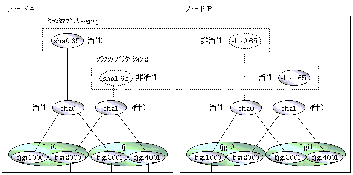 仮想インタフェースで束ねるタグVLANインタフェースは、物理インタフェースの異なるものをそれぞれ指定します。以下に、高速切替方式におけるクラスタシステム上(相互待機)でのタグVLANインタフェース冗長化の構成図を示します。