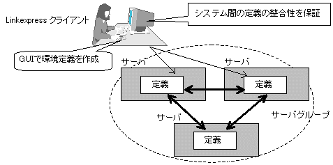 また、環境定義のテキストファイルの配布はLinkexpressでは実現していません。したがって、定義ファイルは利用者による配布が必要です。なお、配布先がUNIXサーバの場合は、利用者が環境定義のテキストファイルをシステムのコード系に合わせてコード変換する必要があります。