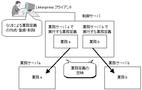 この業務定義は、サーバグループ内の一元管理を行う制御サーバで作成・登録し、その業務を実行する各業務サーバに反映します。