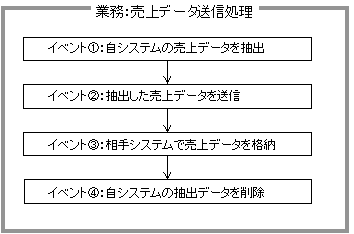 業務定義は、一連の処理の流れを定義したものです。一連の処理を構成する個々の処理をイベントと呼びます。業務定義とイベントの関係について、以下の例に示します。以下の例では、売上データを自システムから相手システムに送信しています。