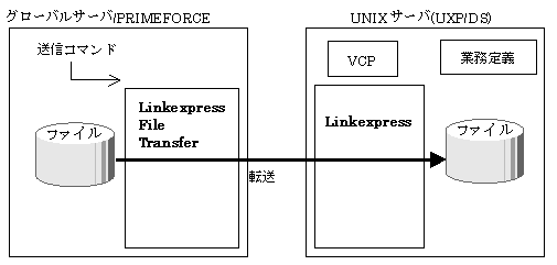 - グローバルサーバ/PRIMEFORCE(起動側)からUNIXサーバ(応答側)へのファイル転送