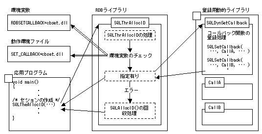 応用プログラムが実行されると、プロセス内で最初に実行されるSQL文の処理において、環境変数およびクライアント用の動作環境ファイルがチェックされ、動的ライブラリ内のSQLDynSetCallback関数が実行されます。なお、プロセス内の最初のSQL文に対しコールバック関数が指定されている場合もコールバック関数は実行されます。