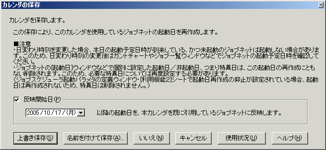 設定した休日情報を保存するときに、[カレンダの保存]ウィンドウで反映開始日を設定することができます。反映開始日を設定することによって、ジョブネットの起動日の再作成は反映開始日以降のみとなります。詳細は、“カレンダの反映開始日を設定する”を参照してください。
