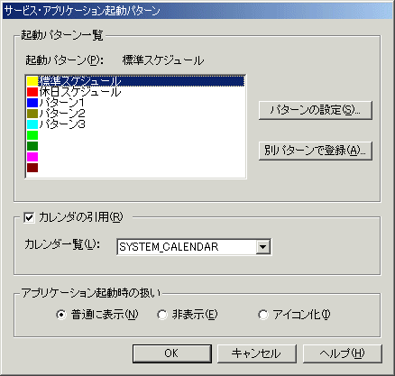 [サービス・アプリケーション起動パターン]ダイアログボックスで[標準スケジュール]を選択します。次に[パターンの設定]ボタンをクリックします。
