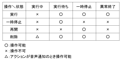 アクションの各状態に対して、操作できる/できないの関係を以下に示します。