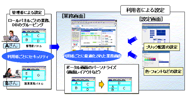 既存のさまざまな業務システムのWeb画面と、用途に合わせて利用者ごとに情報のパーソナライズを容易に行うことができます。