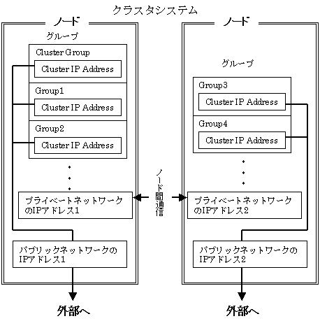 クラスタシステムを構成するノードでは、それぞれ複数のIPアドレスおよびホスト名を管理しています。IPアドレスおよびホスト名には、以下の種類があります。