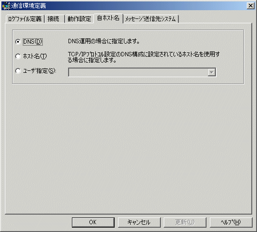 [システム監視設定]-[通信環境定義]から、“自ホスト名”を変更します。運用管理クライアントで、プライマリノード、セカンダリノードで、それぞれ同一の手順で以下を実行します。