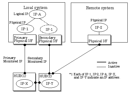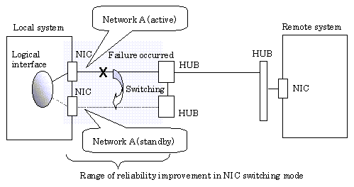 In this mode, duplicated NICs are connected to the same network and switching control of lines is performed based on the exclusive use (During normal operation, one NIC is made to go "up" for communication). A TCP/IP application can conduct communication with the remote system, irrespective of NIC switching, by using an IP address set in this "up" physical interface as its own local system IP address.