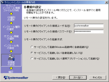 [オプション機能選択]で“リモート操作”を選択した場合、リモート操作の設定を行い、[次へ]ボタンをクリックします。