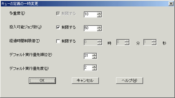 [キューの定義の一時変更]ダイアログボックスでは、実行先キューが混雑してジョブの実行が遅延した場合などに、以下の定義を一時的に変更して対処することができます。なお、一時的に変更したキューの属性内容は、ジョブ実行制御を初期化モードで起動するまでの間、保持されます。