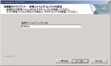 以下の画面は、インストールオプションで“資源配付 クライアント”を選択した場合に表示されます。資源配付の管理ファイルを作成するディレクトリを入力し、[次へ]ボタンをクリックします。