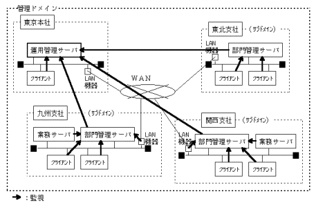 WANを経由した監視対象の部門も管理することが可能ですが、この場合、監視のために発生するトラフィックを軽減するために、ノード状態を監視するためのポーリング回数を減らしたり、運用管理サーバに通知するイベントを絞り込むなどの工夫を施す必要があります。