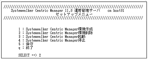 セットアップメニューによるSystemwalker Centric Manager運用管理サーバ環境削除の手順をSolaris OEの場合を例として説明します。