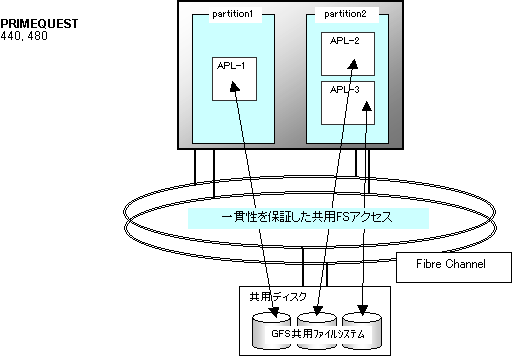 PRIMEQUEST では、1 筐体内を複数のパーティションに分割することで複数ノードとして動作させることが可能です。このような構成で、GFS 共用ファイルシステムを使用することで、ノード間でファイルシステムを共用することができます。