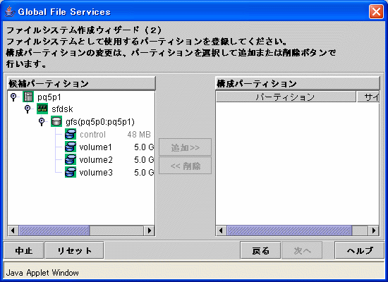 登録するパーティションを[候補パーティション]一覧から選択し、<追加>ボタンを押します。パーティションの選択は、複数同時選択が可能です。ただし、すでにファイルシステムとして使用中のパーティションや管理パーティションは、選択できません。