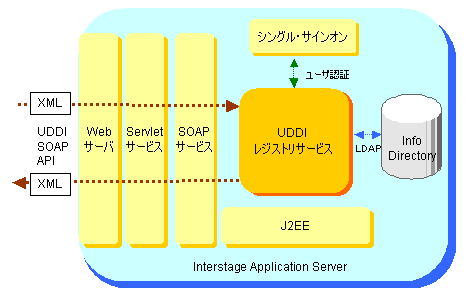 UDDIレジストリサービスの動作に必要なコンポーネントの構成を示します。これらのコンポーネントはすべて、Interstage Application Server Enterprise Editionで提供されます。