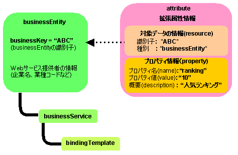 例えば、Webサービス提供者(businessEntity)に対して、「人気ランキング」のデータを付加したい場合、以下の図のように設定することができます。