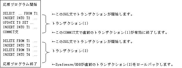 応用プログラムがトランザクション開始状態のままCOMMIT文もROLLBACK文も実行せずに正常に終了する場合には、Symfoware/RDBがトランザクションをロールバックします。