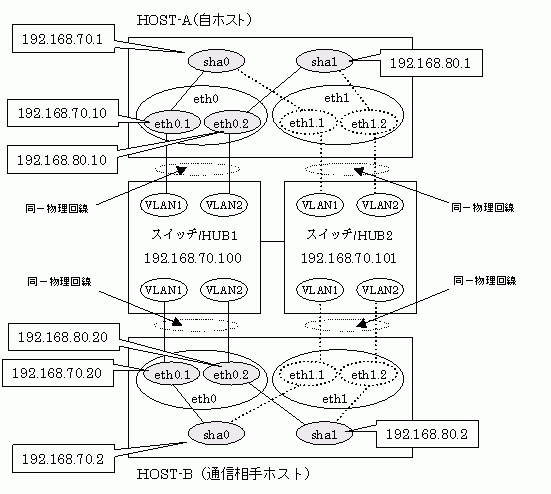 192.168.70.1 hosta # HOST-Aの仮想IP 192.168.70.10 host71 # HOST-Aの物理IP (タグVLANインタフェース) 192.168.80.1 hostb # HOST-Aの仮想IP 192.168.80.10 host81 # HOST-Aの物理IP (タグVLANインタフェース) 192.168.70.2 hostc # HOST-Bの仮想IP 192.168.70.20 host72 # HOST-Bの物理IP (タグVLANインタフェース) 192.168.80.2 hostd # HOST-Bの仮想IP 192.168.80.20 host82 # HOST-Bの物理IP (タグVLANインタフェース) 192.168.70.100 swhub1 # primary監視先スイッチ/HUBのIP 192.168.70.101 swhub2 # secondary監視先スイッチ/HUBのIP |
