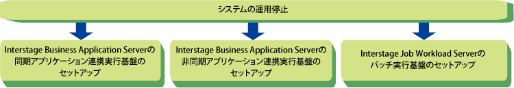 “Interstage Business Application Server”の同期アプリケーション連携実行基盤、“Interstage Business Application Server”の非同期アプリケーション連携実行基盤、および“Interstage Job Workload Server”のバッチ実行基盤のセットアップについて、セットアップ順序は任意です。