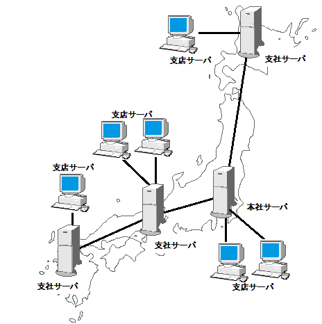 改善点 : 全国の支社サーバ、支店サーバを専用線で本社サーバと結合し、各サーバに対してLinkexpressを導入しました。また、全国の支店サーバの業務状態を監視画面で管理できるようにしました。