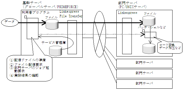 基幹サーバ(グローバルサーバ/PRIMEFORCE)上の利用者プログラムによって、各部門サーバ(PC/UNIXサーバ)へのファイル配信業務を行います。業務終了後の業務の結果確認も利用者プログラムによって行います。