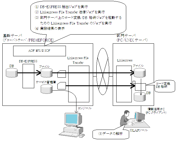 基幹サーバ(グローバルサーバ/PRIMEFORCE)上のAOFまたはSCFによって、基幹データベースから部門サーバ(PC/UNIXサーバ)へのデータ流通を運用します。業務終了後、パソコンのOLAPツールを使ってデータを解析します。
