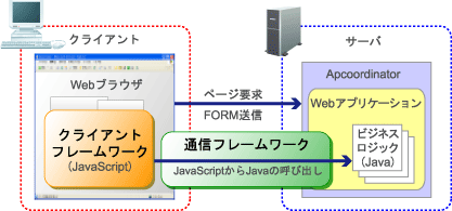 Ajaxフレームワークは、Webブラウザ上のJavaScriptで動作するクライアントフレームワークと、JavaScriptからサーバ側のビジネスロジックを呼び出す通信フレームワークから構成されています。