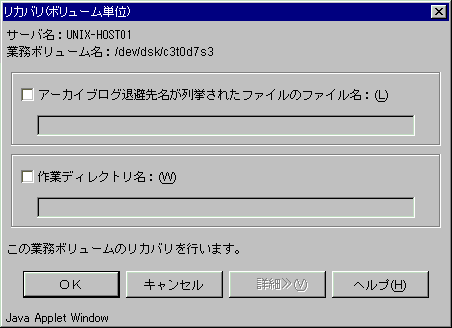 業務ボリューム一覧画面で選択したSymfowareのロググループに含まれる業務ボリュームを最新の状態にリカバリします。リカバリはボリューム単位で行われます。本画面は、管理対象のStorageサーバがSolarisサーバ、LinuxサーバまたはWindowsサーバの場合のみとなります。