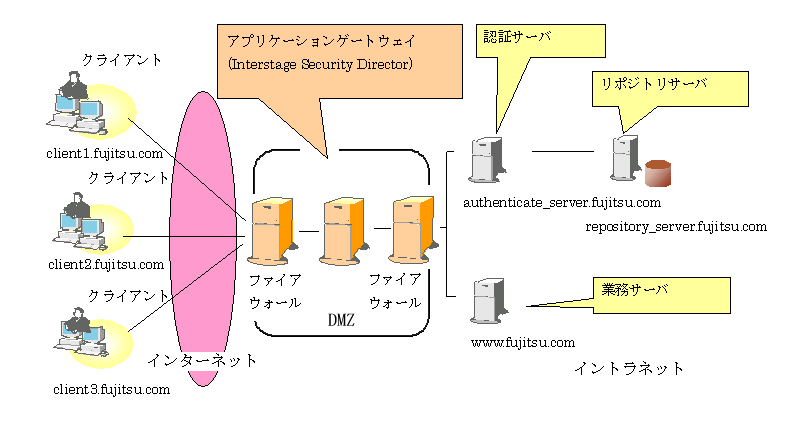 クライアントがインターネットからアクセスする場合は、DMZに配置したアプリケーションゲートウェイを経由するようにシステムを構成してください。各サーバはイントラネットに配置し、インターネットから直接アクセスできないように保護する必要があります。アプリケーションゲートウェイには、Interstage Security Directorを使用することができます。Interstage Security Directorと連携した運用方法については、“シングル・サインオン運用ガイド”の“概要”の“高性能・高信頼性システム”の“Interstage Security Directorとの連携”を参照してください。