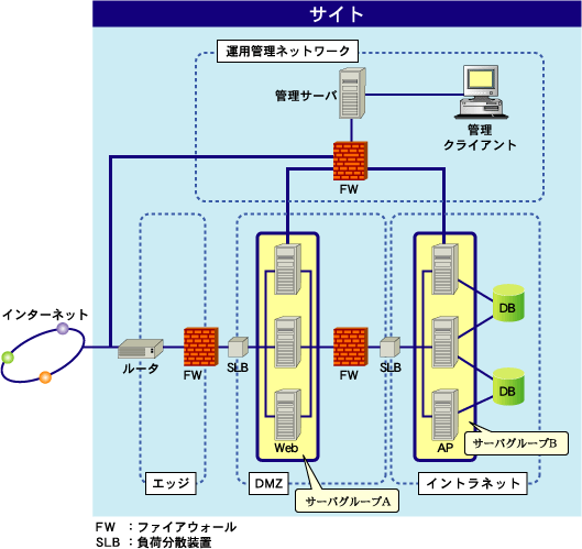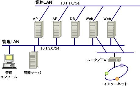 Systemwalker Resource Coordinator連携を行う際には、実際の業務データが流れるLANと、管理サーバと管理対象サーバの間で運用管理のデータを流すLANとを分ける方法が一般的です。前者を業務LANと呼び、後者を管理LANと呼びます。以下に、業務LANと管理LANの概念を表す図と、Systemwalker Resource Coordinator連携の一般的な運用モデルを示します。これは、マルチサーバ管理機能と同様です。詳細は、“マルチサーバ管理の構成モデル”を参照してください。