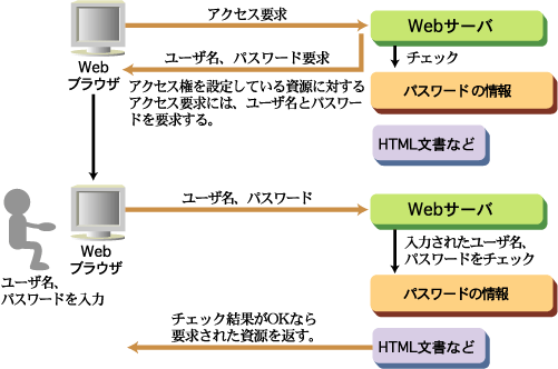 サーバは、ユーザがクライアント(Webブラウザ)で入力するユーザ名とパスワードによって、資源へのアクセスが許可されているかを確認します。