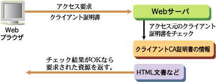 クライアント認証は、サーバ上の資源に対し、クライアント証明書の記載事項によりアクセスを制限する機能です。これによりクライアント(Webブラウザ)の身元を保証することができます。