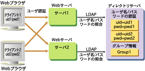 この機能を使用することにより、ディレクトリサーバがユーザ名/パスワードの一括管理を行い、Webサーバ間共通のユーザ名/パスワードの使用が可能となります。