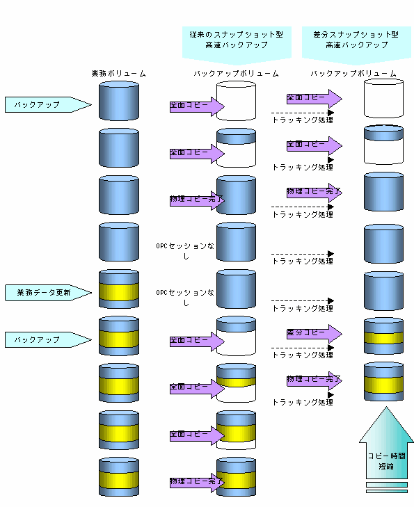 OPCを利用したスナップショット型高速バックアップでは、バックアップ(OPC)を起動するたびに業務ボリューム全体をバックアップボリュームへコピーする必要がありました。しかし、同じ業務ボリュームとバックアップボリュームのペアを使用する限り、業務ボリューム全体を毎回物理コピーする必要はなく、前回のバックアップ起動時点からの差分データのみを物理コピーすることによって完全なスナップショットイメージを作成できるため、物理コピー時間の大幅な短縮が可能です。
