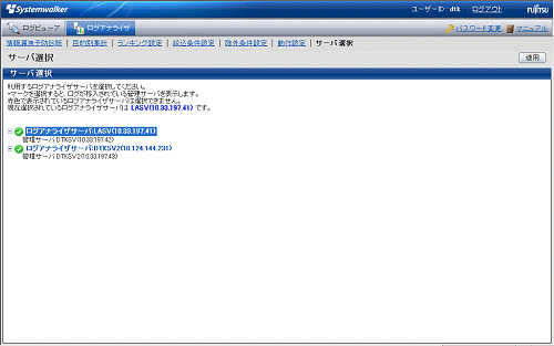赤色で表示されたログアナライザサーバは使用できません。したがって、選択できません。当該サーバについては、“Systemwalker Desktop Keeper リファレンスマニュアル”の“Webコンソールで出力されるメッセージ”を参照し、[ERR-DTLAC001]の対処を行ってください。