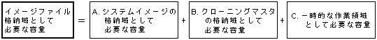 イメージファイル格納域として必要な容量は、"システムイメージの格納域として必要な容量"、"クローニングマスタの格納域として必要な容量"、"一時的な作業領域として必要な容量"を合計した値です。