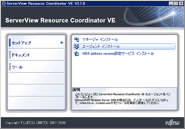 Windowsのコントロール パネルで"プログラムの追加と削除"を開き、"ServerView Resource Coordinator VE Agent"が表示されている場合はアンインストールを行ったあと、再度、インストールを行います。