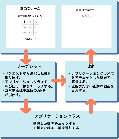 本章で開発するWebアプリケーションは、Webブラウザ上で1から9までの任意の数を当てるアプリケーションです。アプリケーションはサーブレットとJSPから構成されます。